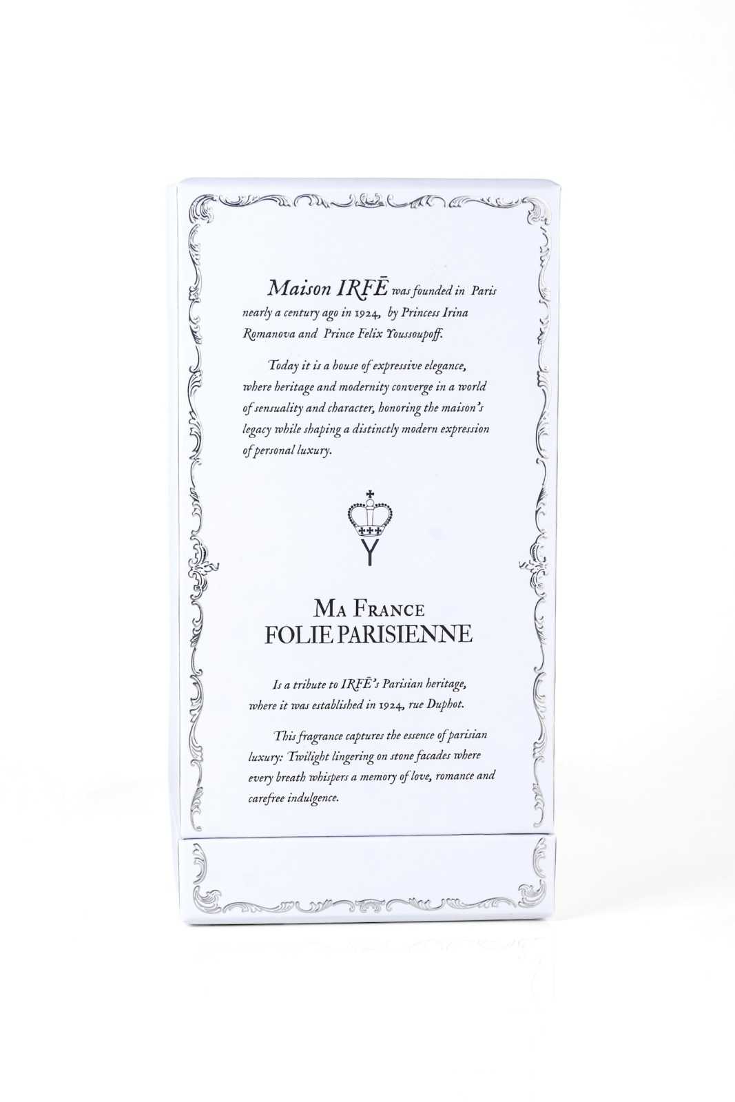 Ma France Folie Parisienne by Maison IRFĒ embodies Parisian elegance, drawing inspiration from the house’s couture heritage and its original Rue Duphot boutique in Paris, established in 1924. This chypre floral composition blends luminous citrus and aromatic facets with a sensual floral heart of rose, jasmine, and cocoa absolute, unfolding into a richly textured base of amber, labdanum, patchouli, vanilla, and balsamic resins. Both nostalgic and modern, the fragrance evokes twilight in Paris—where romance, indulgence, and effortless sophistication converge. Crafted by master perfumer Rodrigo Flores-Roux, Ma France Folie Parisienne captures timeless Parisian allure through a bold yet graceful olfactory signature designed to transcend gender and era.